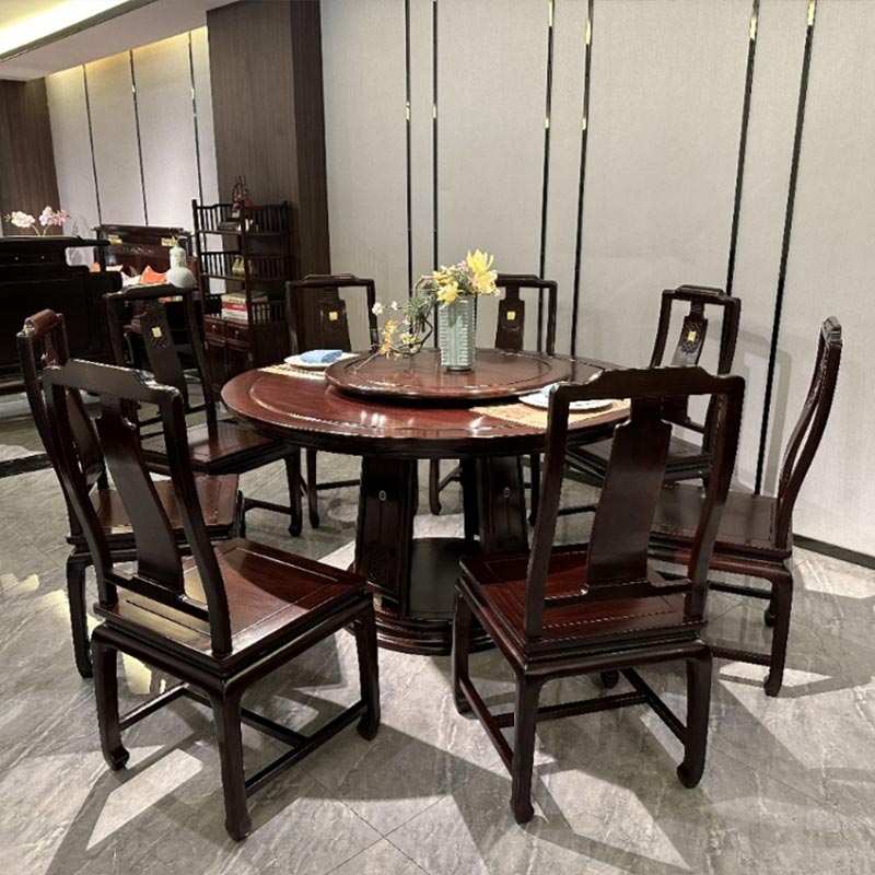 当社の工場からアジアンラウンドダイニングテーブルセットを安心して購入できます。厳選された黒檀は堅い木肌で、深く神秘的な光沢を放ちます。完璧な品質を実現するために、それぞれの木材が慎重に選択されています。川天江レッドウッド工場で丁寧に生産されています。黒檀独特の風合いがあり、顔に安定感と重厚感が漂います。千年の匠の技を受け継いだほぞほぞ構造で、釘や接着剤を使わずに非常に丈夫です。これは単なる技術ではなく、古代人の知恵と工夫を示す文化遺産でもあります。ほぞ穴とほぞの構造の使用は伝統的かつ絶妙で、円形テーブルの構造が安定しており、長期間使用できます。